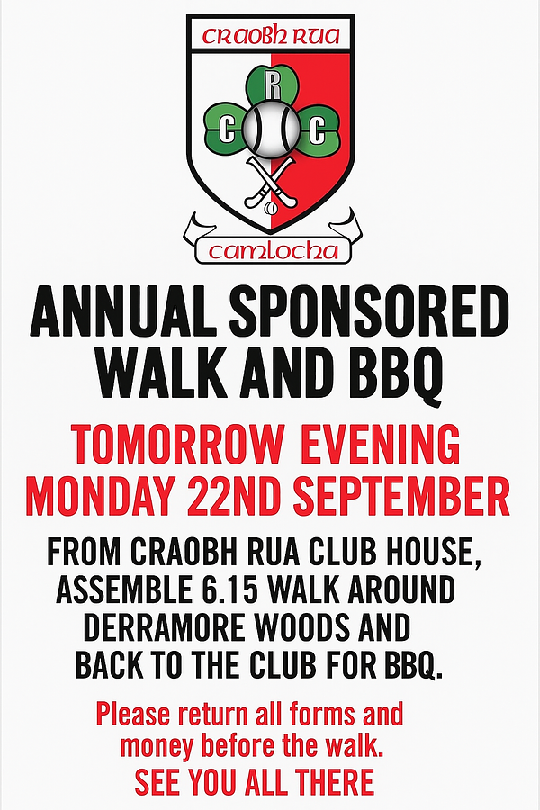 Our annual sponsored walk and BBQ is taking place tomorrow evening Monday 22nd September at 6.30 from Craobh rua club house assemble 6.15 walk around Derramore Woods and back to the club for the BBQ. Please return your card and money before the walk. All welcome! See you there. Rua Abu 🇵🇪