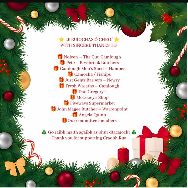 Craobh Rua would like to say a huge thank you to the wonderful businesses and members who generously supported our Christmas Raffle.