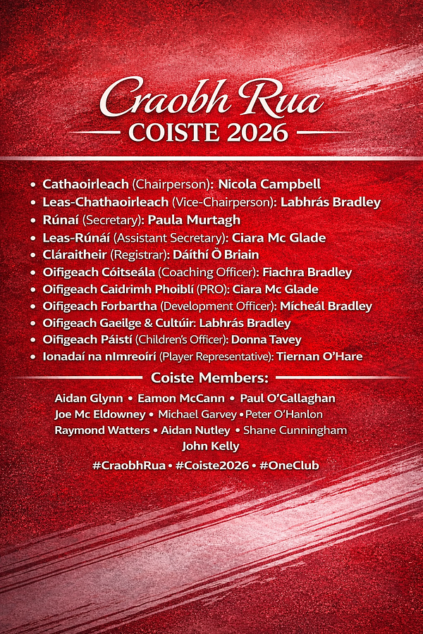 🔴⚪ Craobh Rua AGM ⚪🔴 Following our recent AGM, we are delighted to confirm the appointment of Nicola Hanna as Cathaoirleach, making history as the first female Chairperson of Craobh Rua. This is a hugely significant milestone for the club. Nicola has already made an outstanding contribution through her dedication, leadership and tireless work across many areas of club life as vice- chair. We have no doubt she will continue to drive Craobh Rua forward with passion, commitment and vision as we look to the future. We are also delighted to welcome the newly elected Coiste for 2026, a strong and enthusiastic group who are ready to build on the great progress already made. With an exciting year of hurling ahead, there is a real sense of momentum and positivity around the club. A sincere thank you to the outgoing committee for their hard work, time and commitment over the past year. Your efforts have helped put Craobh Rua in a very strong position going forward. Here’s to another successful year for our players, mentors, volunteers and supporters 🔴⚪