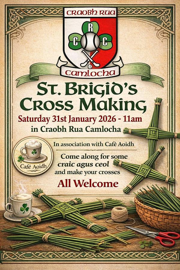Join us tomorrow (Saturday 31st January) in Craobh Rua Camlocha for a lovely morning of St Brigid’s Cross making.