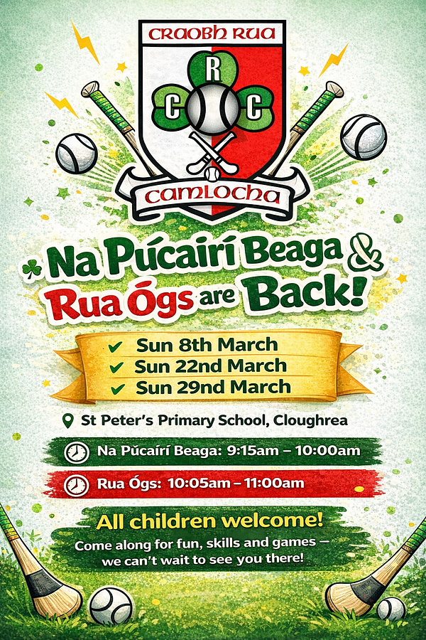 We’re delighted to welcome all our young camógs and hurlers back again this Sunday as Na Pucairí Beaga and Rua Ógs sessions return.
