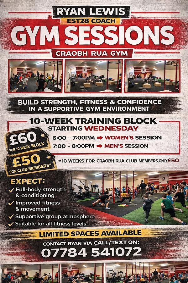 🔥 NEW GYM SESSIONS with Ryan Lewis – EST28 Coach 🔥 📍 Craobh Rua Gym Ready to build strength, fitness & confidence in a supportive, friendly environment? 💪 Join our 10-week training block starting Wednesday: 🕕 6:00–7:00pm – Women’s Session 🕖 7:00–8:00pm – Men’s Session 💷 £60 for 10 weeks 💷 Craobh Rua club members: only £50 ✅ Full-body strength & conditioning ✅ Improved fitness & movement ✅ Supportive group atmosphere ✅ Suitable for all fitness levels ⚠️ Limited spaces available! 📲 Contact Ryan via call/text on 07784 541072 to secure your spot. Tag a friend who should join you