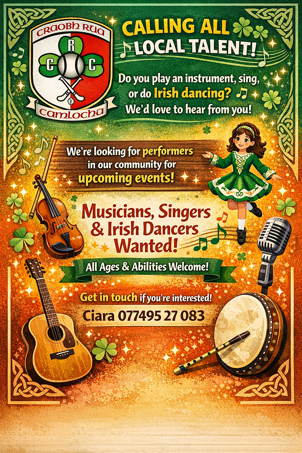 Whether you play an instrument, love to sing, or enjoy Irish dancing, we’d love to hear from you. All ages and abilities are welcome – it’s all about bringing our community together and celebrating local talent. 🔴⚪