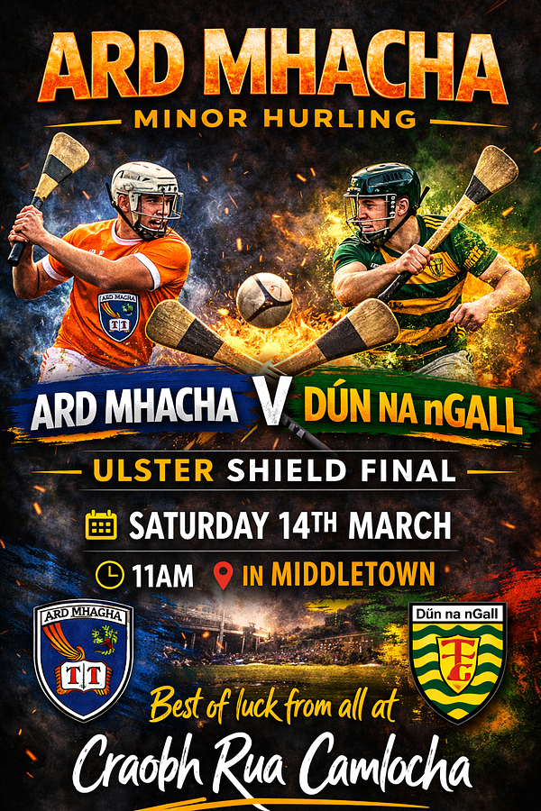 Best of luck to the Ard Mhacha Minor Hurlers this Saturday as they face Dún na nGall in the Ulster Shield Final.