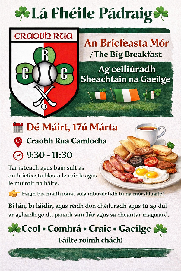 Come along to Craobh Rua Camlocha and enjoy a delicious breakfast, great company, and plenty of community spirit before heading off to take part in the Lá Fhéile Pádraig Parade in Newry.