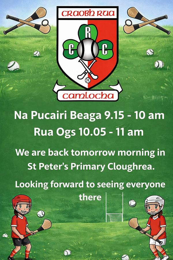 Our Na Pucairí Beaga and Rua Ógs sessions return tomorrow. Looking forward to seeing all our wonderful Hurlers and Camogs.